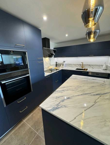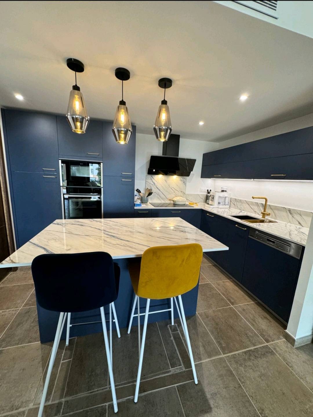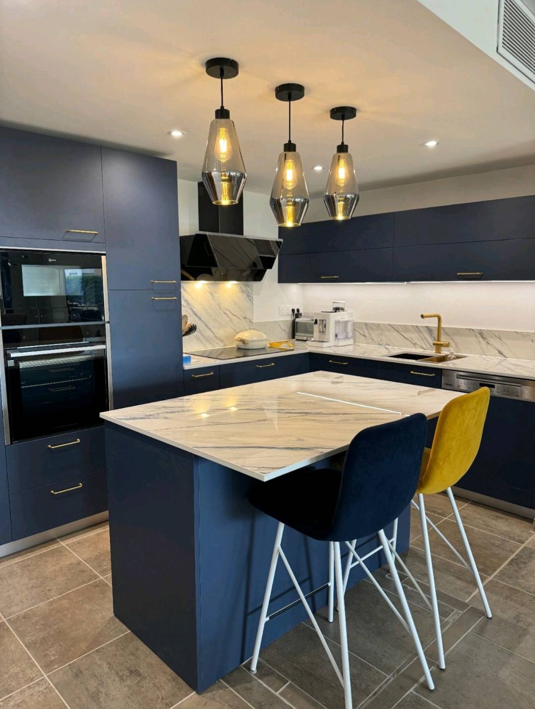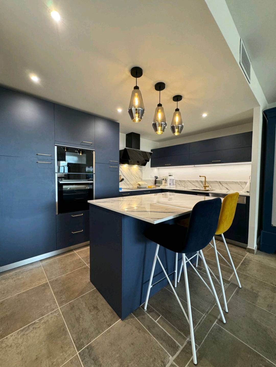 Réalisation d'une cuisine Sagne tendance blue à Saint-Raphaël 83 par Thalassa Cuisines. Nous avons réalisé cette cuisine avec un coloris Bleu Jeans, plans de travail en Dekton Trance blue Gloss et avec des poignées en laiton doré.