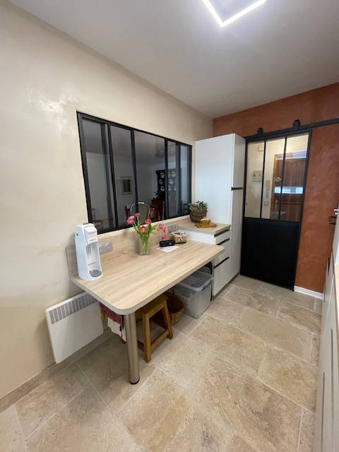 Les travaux incluent l'ouverture d'une cloison séparant le séjour pour accueillir une verrière atelier coulissante, ainsi qu'une porte atelier verrière coulissante. Le sol est sublimé par un carrelage en grès céram pleine masse ton Pierre, tandis que la peinture déco de type stucco en tons Pierre et Terracotta ajoute une touche de sophistication.