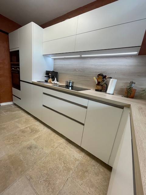 Arborant une esthétique moderne, la cuisine présente des éléments distinctifs tels que des façades en blanc supermat, des poignées gorges en inox brossé et un plan de travail Compact de 40 mm en chêne brossé, équipé d'une cuve par-dessous et d'un égouttoir strié.